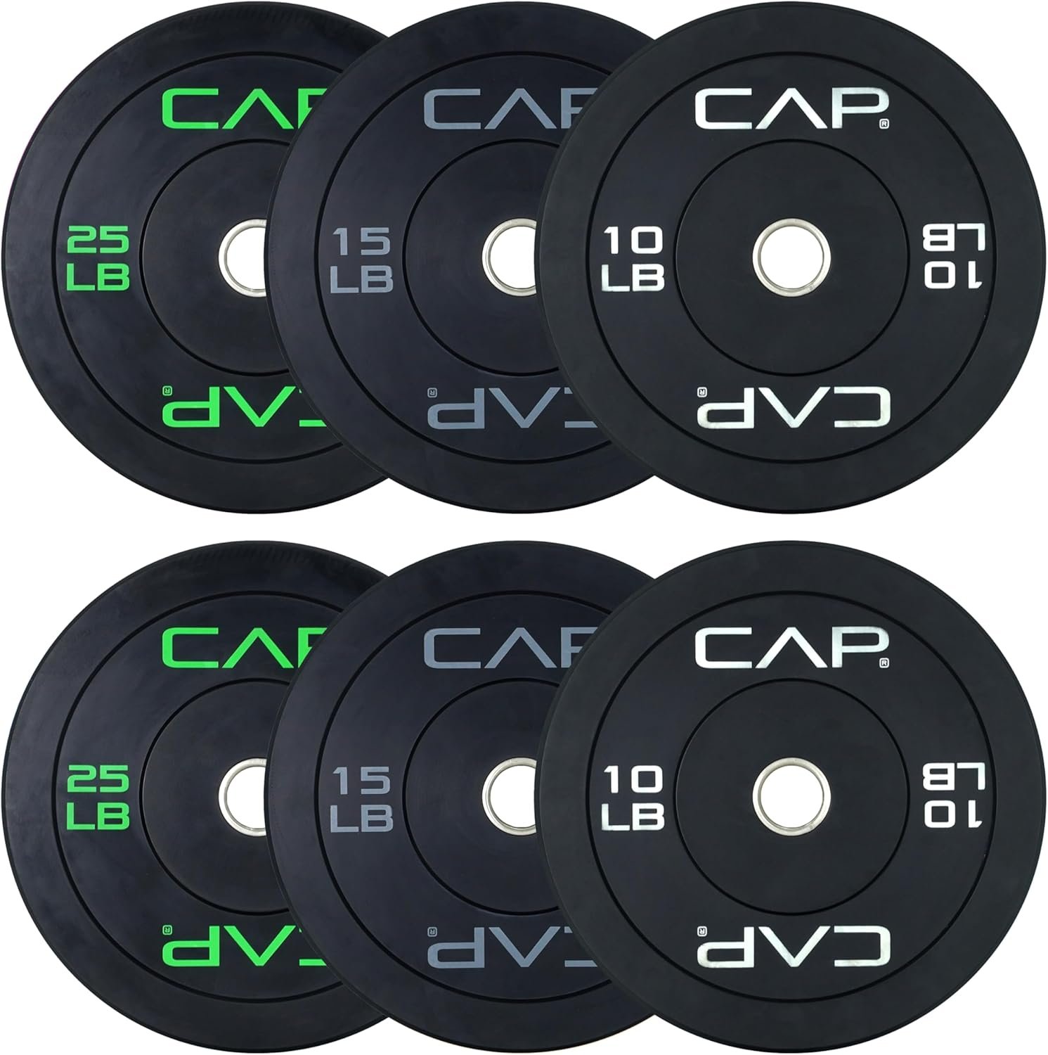 Upgrade your home gym with the CAP Barbell Olympic Bumper Plate Weight Set, designed for Olympic barbells and constructed with durable virgin and recycled rubber for long-lasting use. This set includes three pairs of plates (10lb, 15lb, and 25lb) with reinforced steel hubs, ensuring a secure fit and preventing bar damage. Ideal for all fitness levels, these bumper plates offer balanced weight, protect equipment, and help you maximize your workout. Perfect for anyone looking to boost strength and calorie burn at home.